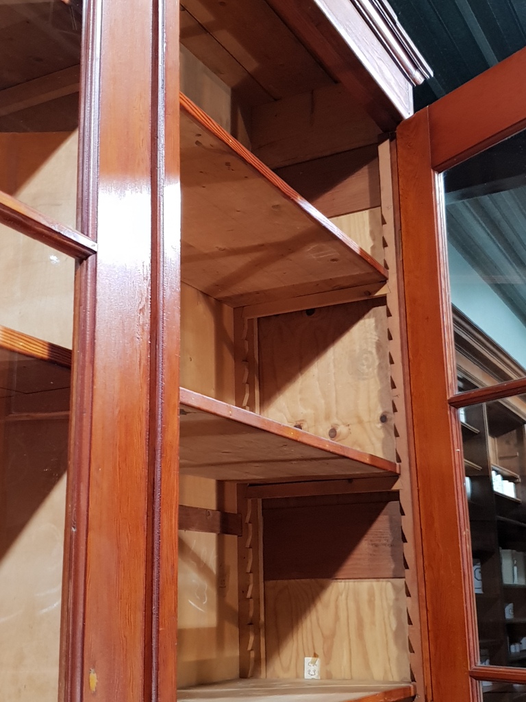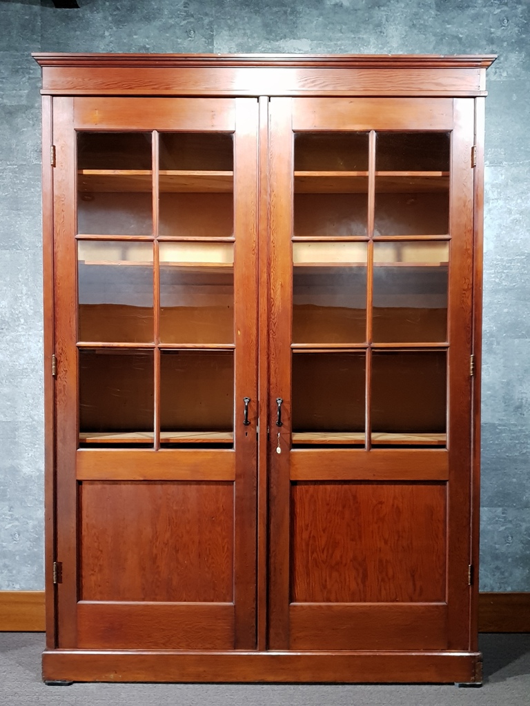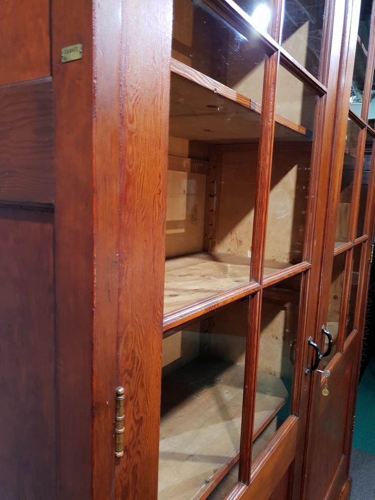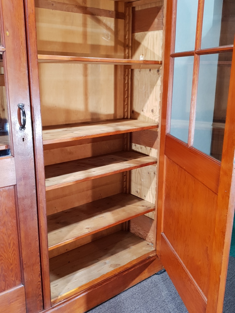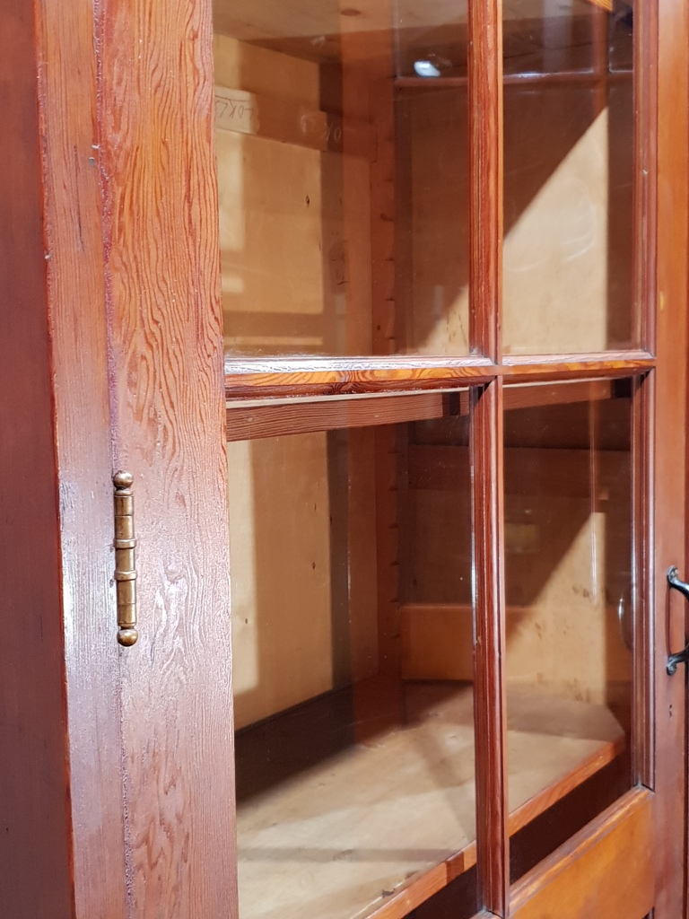 This cabinet is made of beautiful solid pitch pine with veneer panelung on the sides and lower front. The cabinet has two doors from top to bottom with glass to the upper half and solid timber to the base. There are 12 adjustable solid timber shelves with lots of space. The doors have working locks and an original and labeled key.