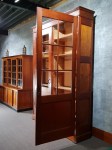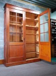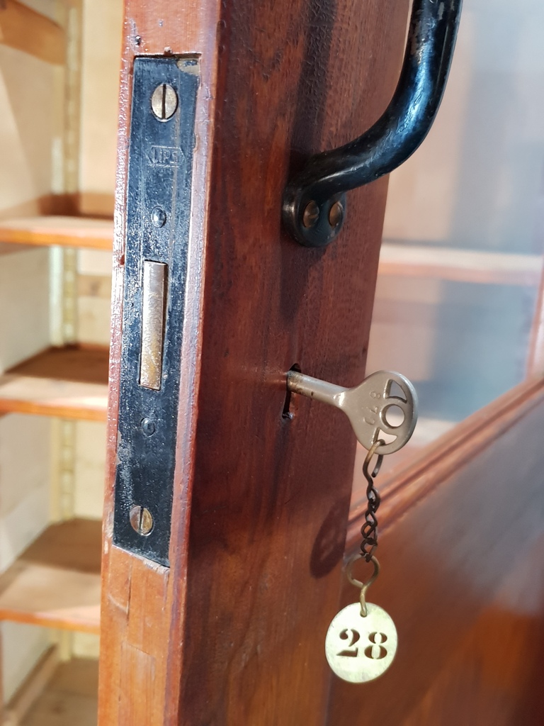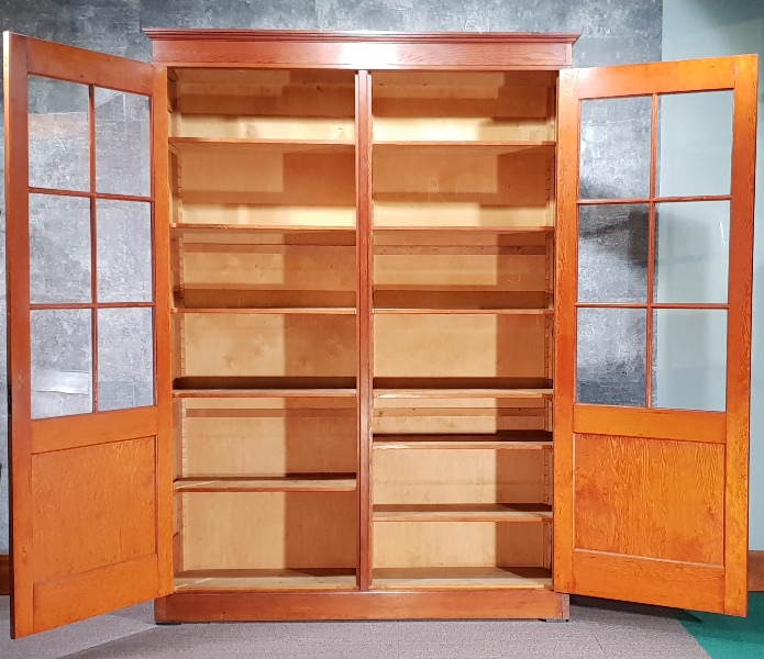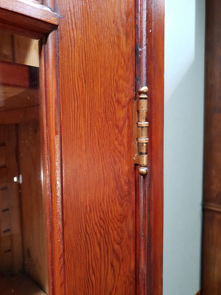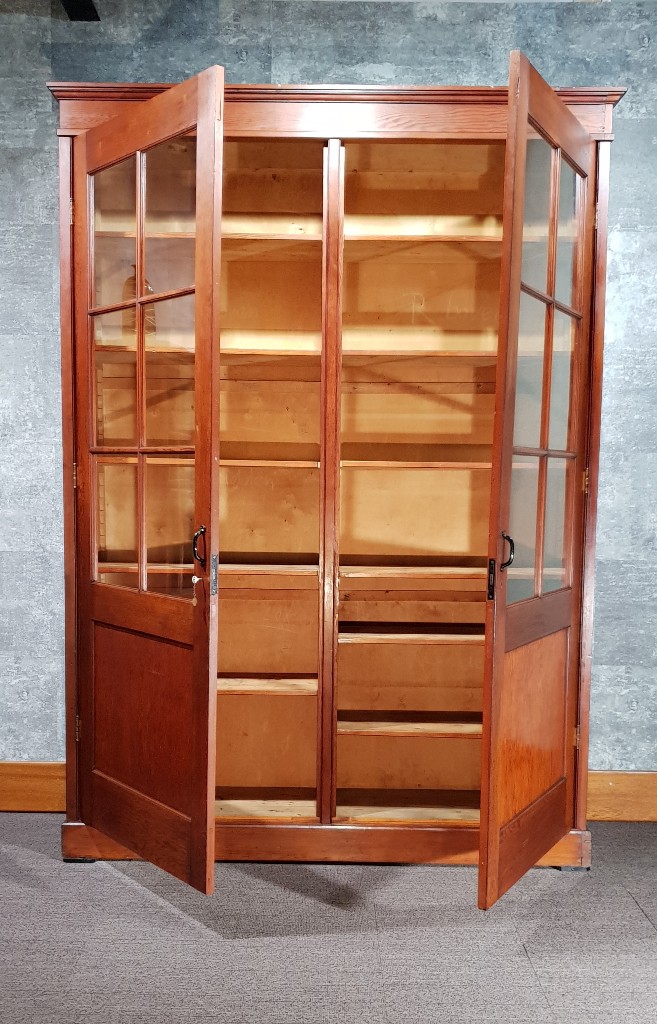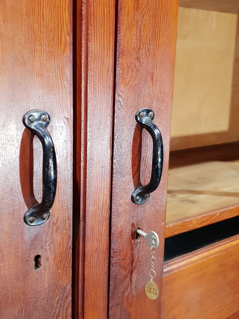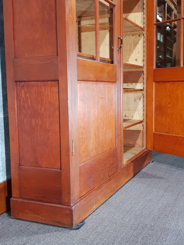 This cabinet is made of beautiful solid pitch pine with veneer panelung on the sides and lower front. The cabinet has two doors from top to bottom with glass to the upper half and solid timber to the base. There are 12 adjustable solid timber shelves with lots of space. The doors have working locks and an original and labeled key.